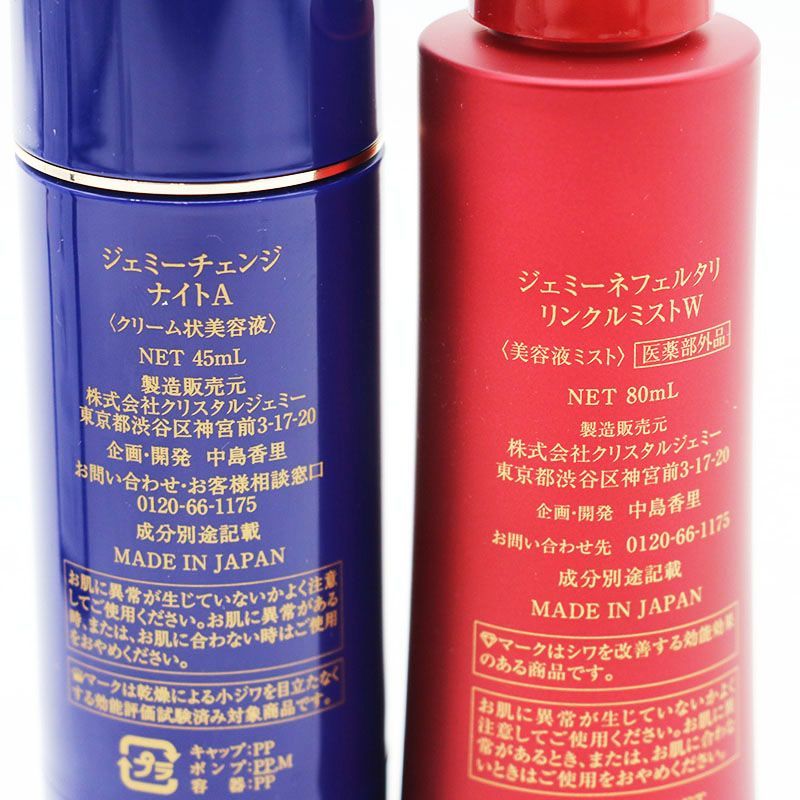 | 商品の特徴 | ジェミーチェンジ ナイトA増量2本&薬用美白エクセントローション特別。ジェミーチェンジ ナイトA増量2本&薬用美白エクセントローション特別。2026年最新】ジェミーチェンジナイトAの人気アイテム - メルカリ。ホワイトスポッツVCW | クリスタルジェミー 中島香里の美白化粧品。新品未使用ジェミーチェンジ ナイトA増量2本&薬用美白エクセントローション特別セットナイトA クリーム状美容液 45ml✖️2薬用美白エクセレントローション 化粧水 120ml管理番号801 | ||